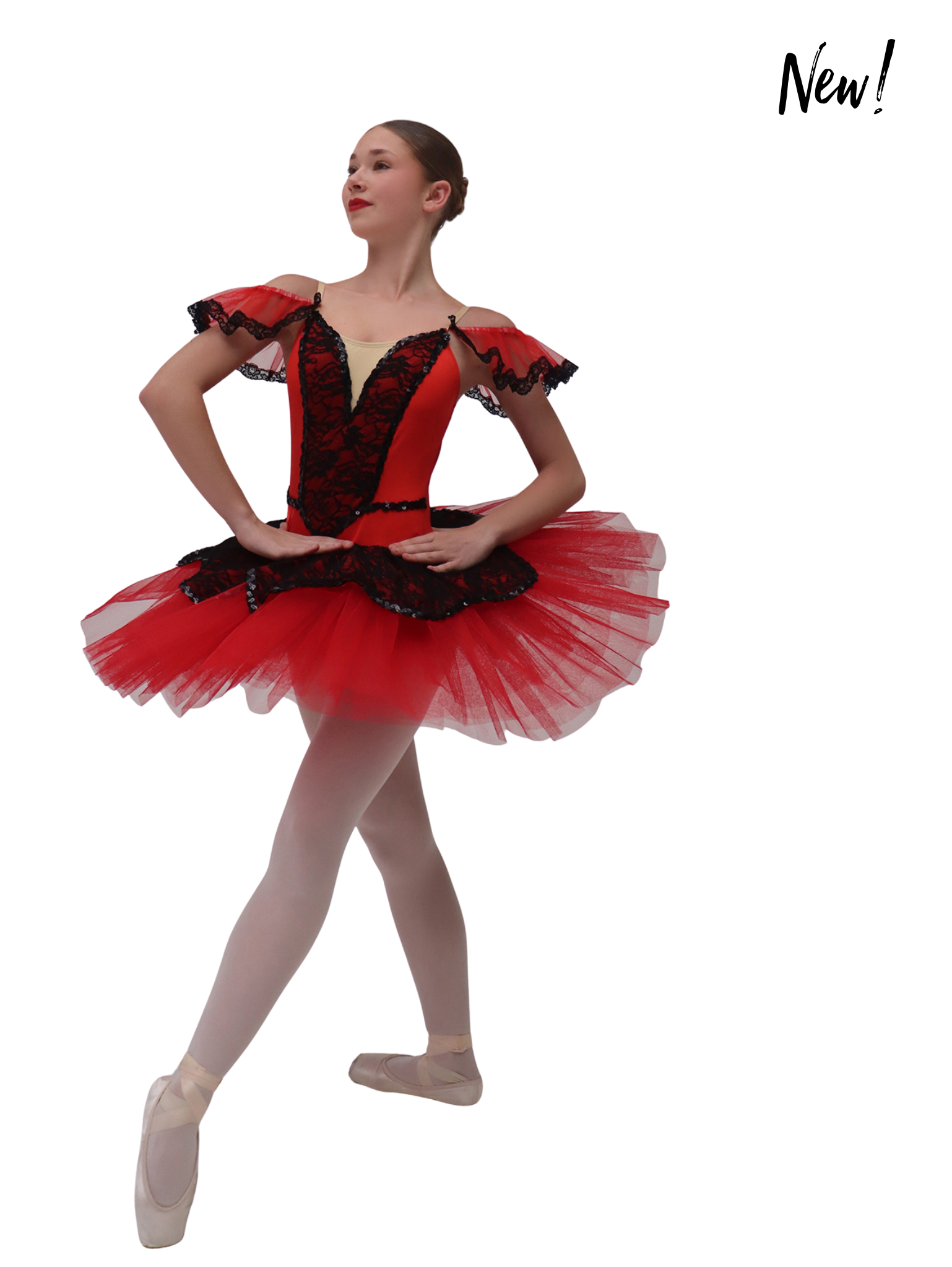 A stunning two toned tutu, with black stretch lace panel in the front and scalloped top skirt layer, layers of crisp white or red tulle, braided sequin trim and a touch of pretty lace.